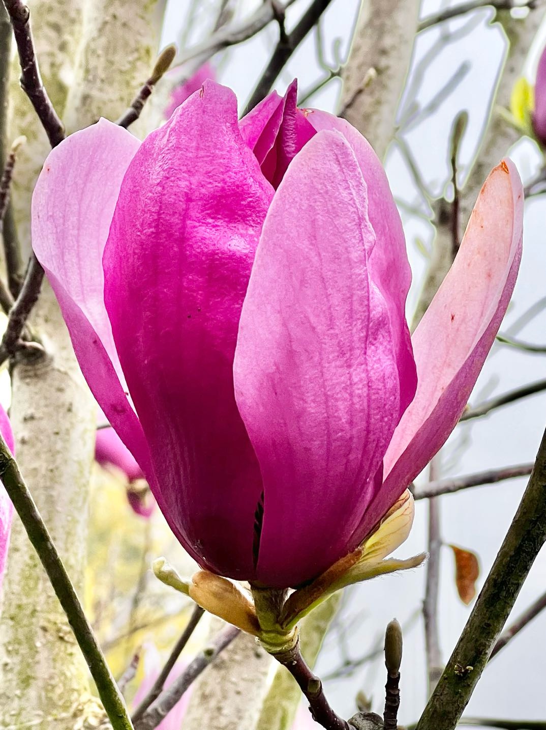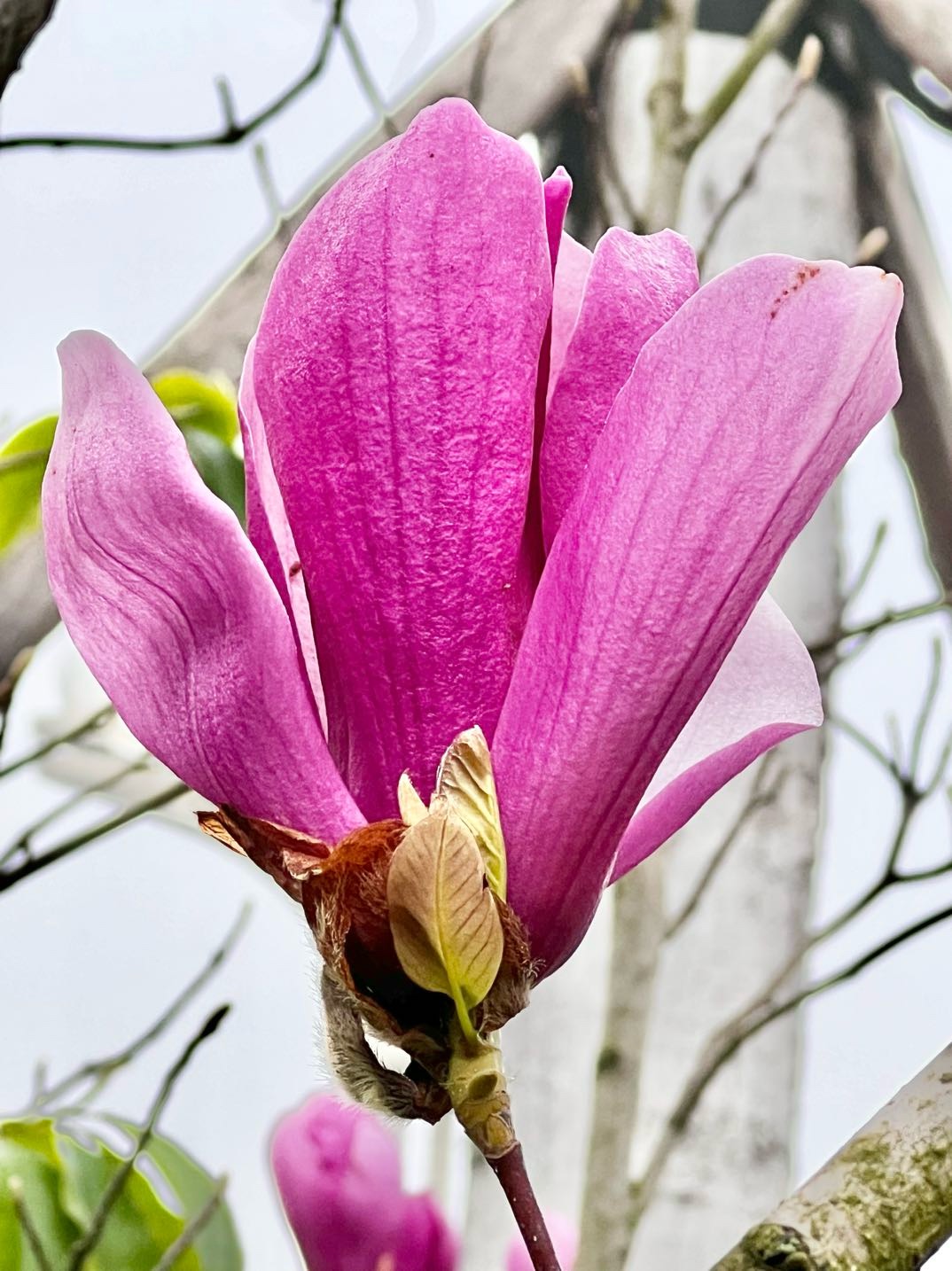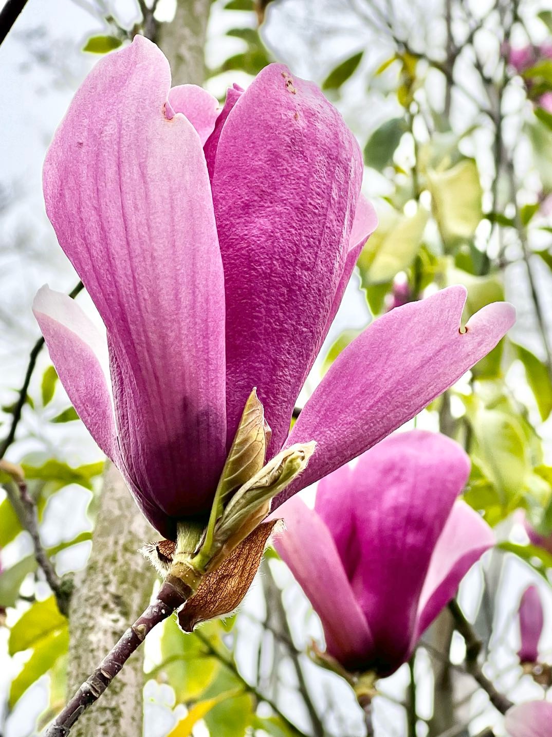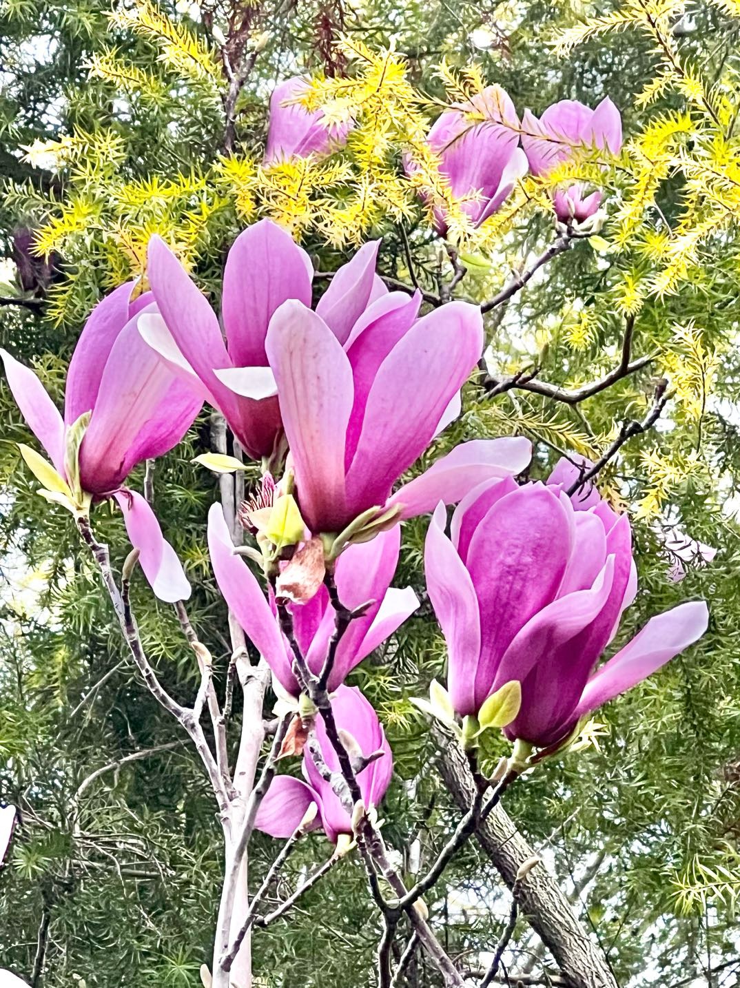 近日路过沱一桥景观带,抬眼间撞进一片紫玉兰花的温柔乡。有的花苞饱满欲裂,藏着无尽期待;有的全然盛放,肆意展示绰约风姿;风过时花枝轻摇,送来春的低语,驱散满心疲惫,只留下纯粹的欢喜。