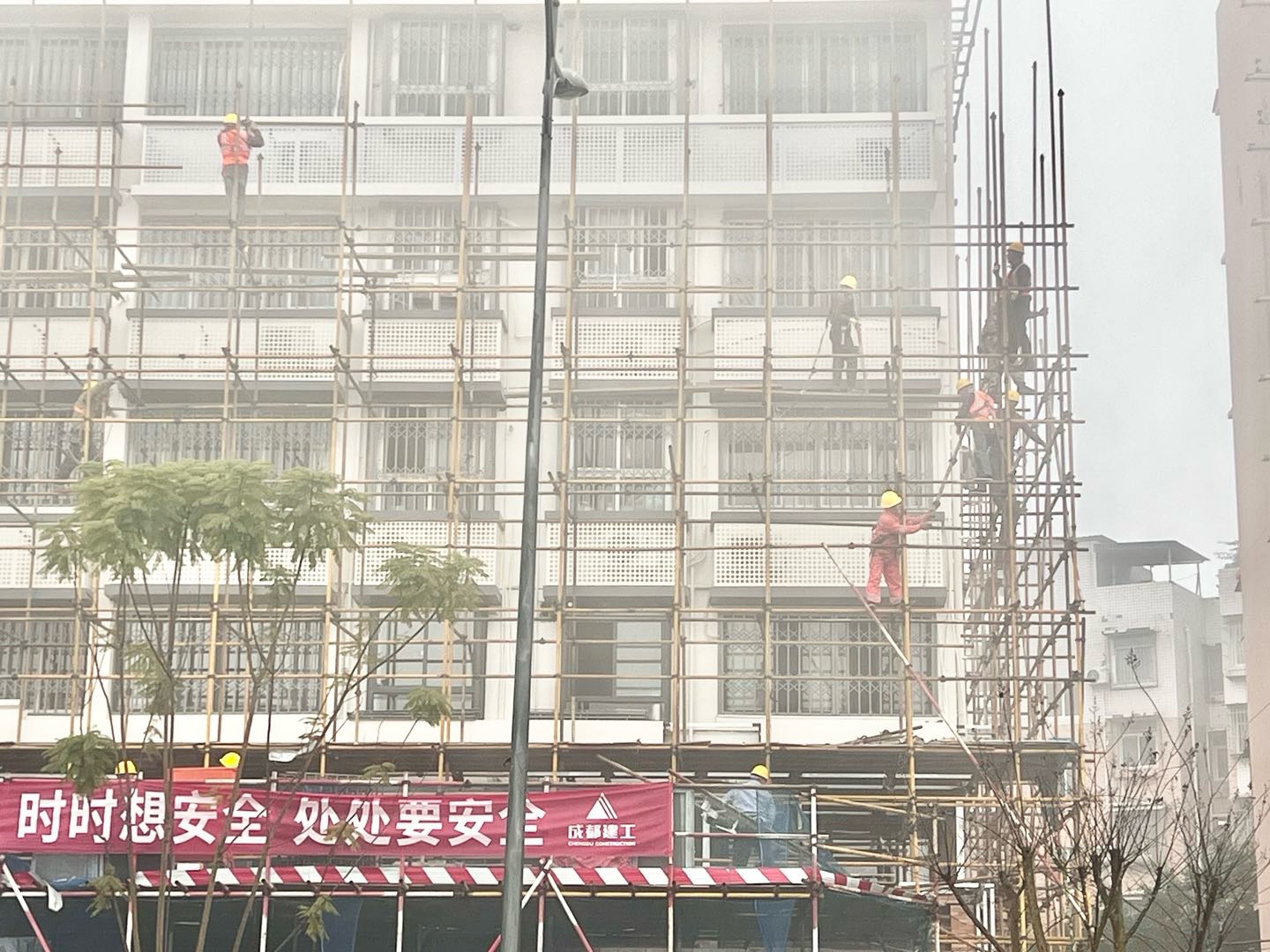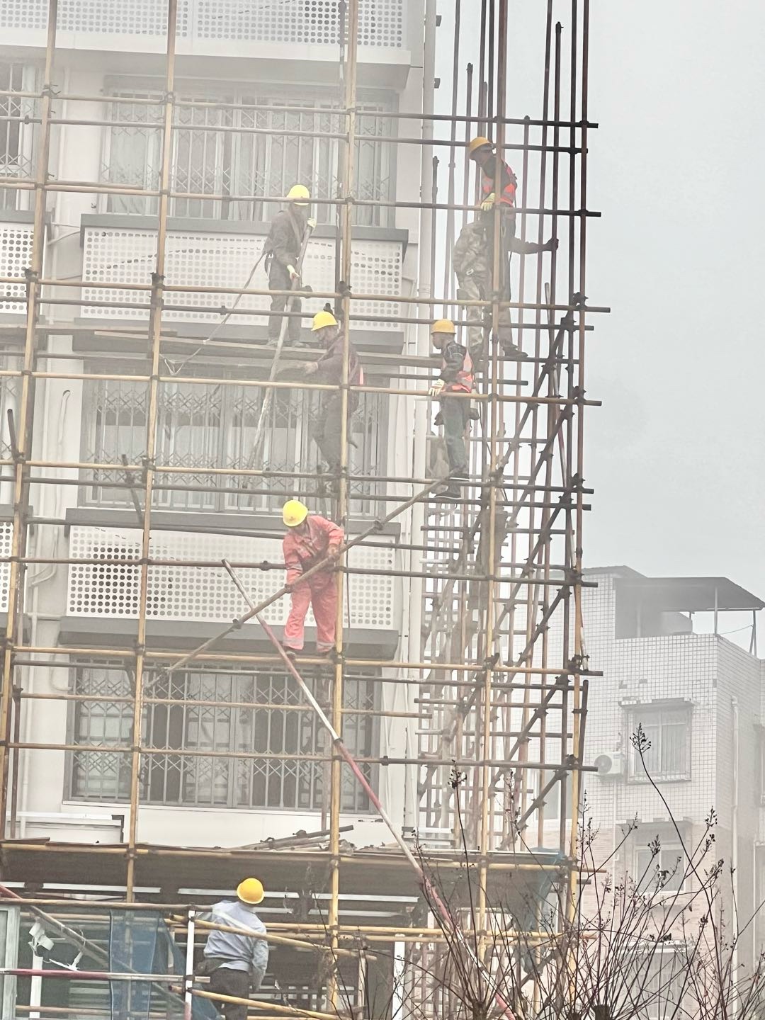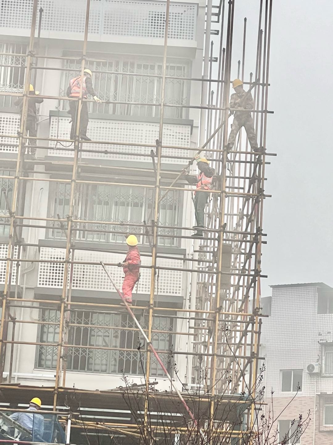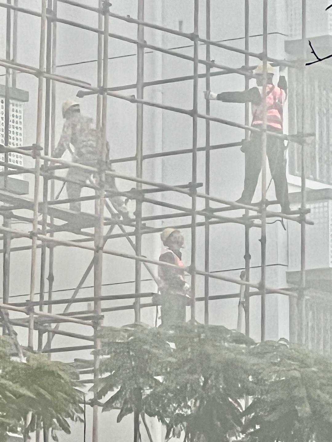 一早大雾弥漫,寒气逼人。可苌弘广场丁字路口的高楼装修现场一片繁忙。工人们冒着严寒,在浓雾中拆除已完成楼面装修的脚手架、转运钢管、建材等,各个环节紧张有序。
