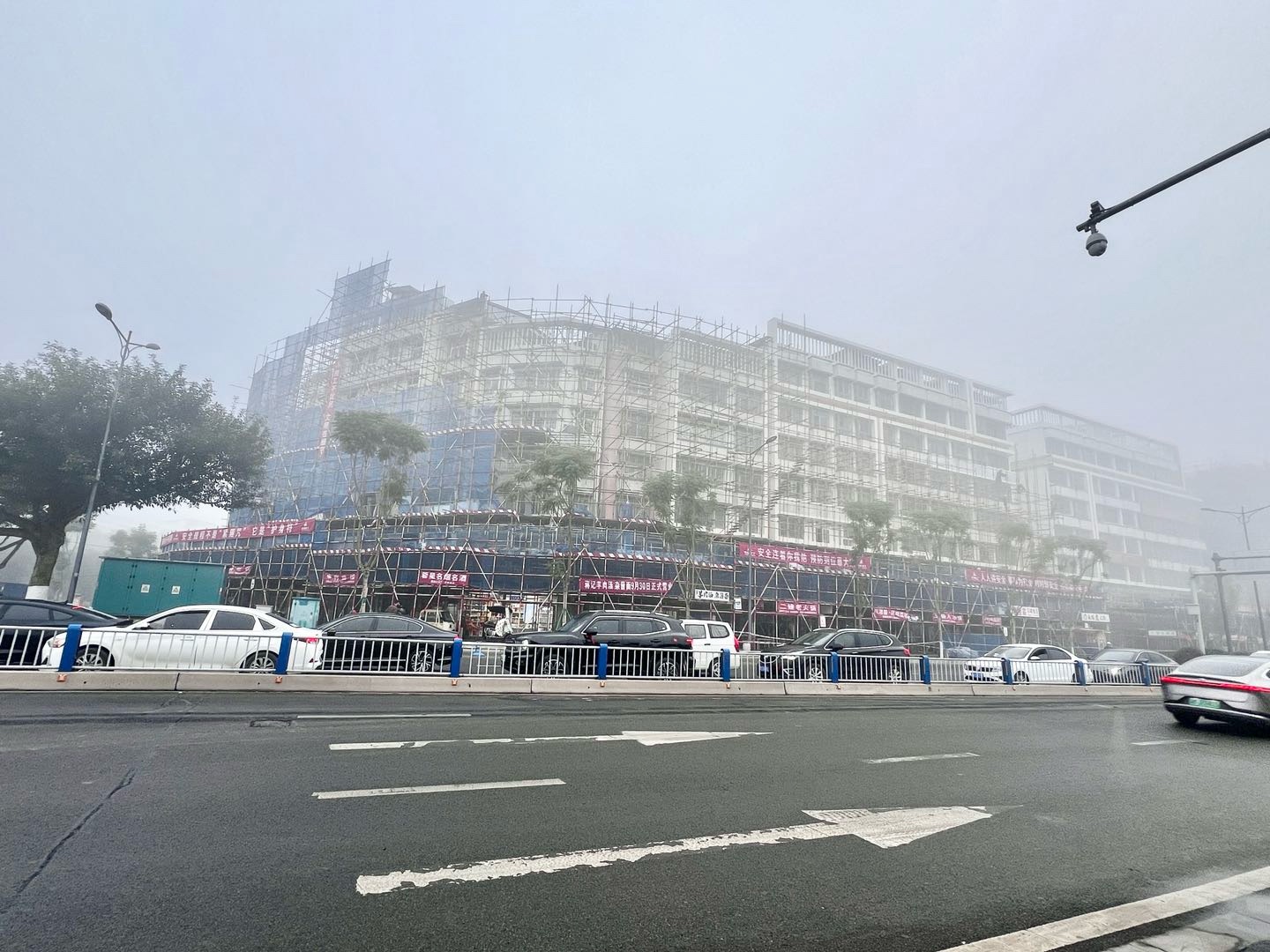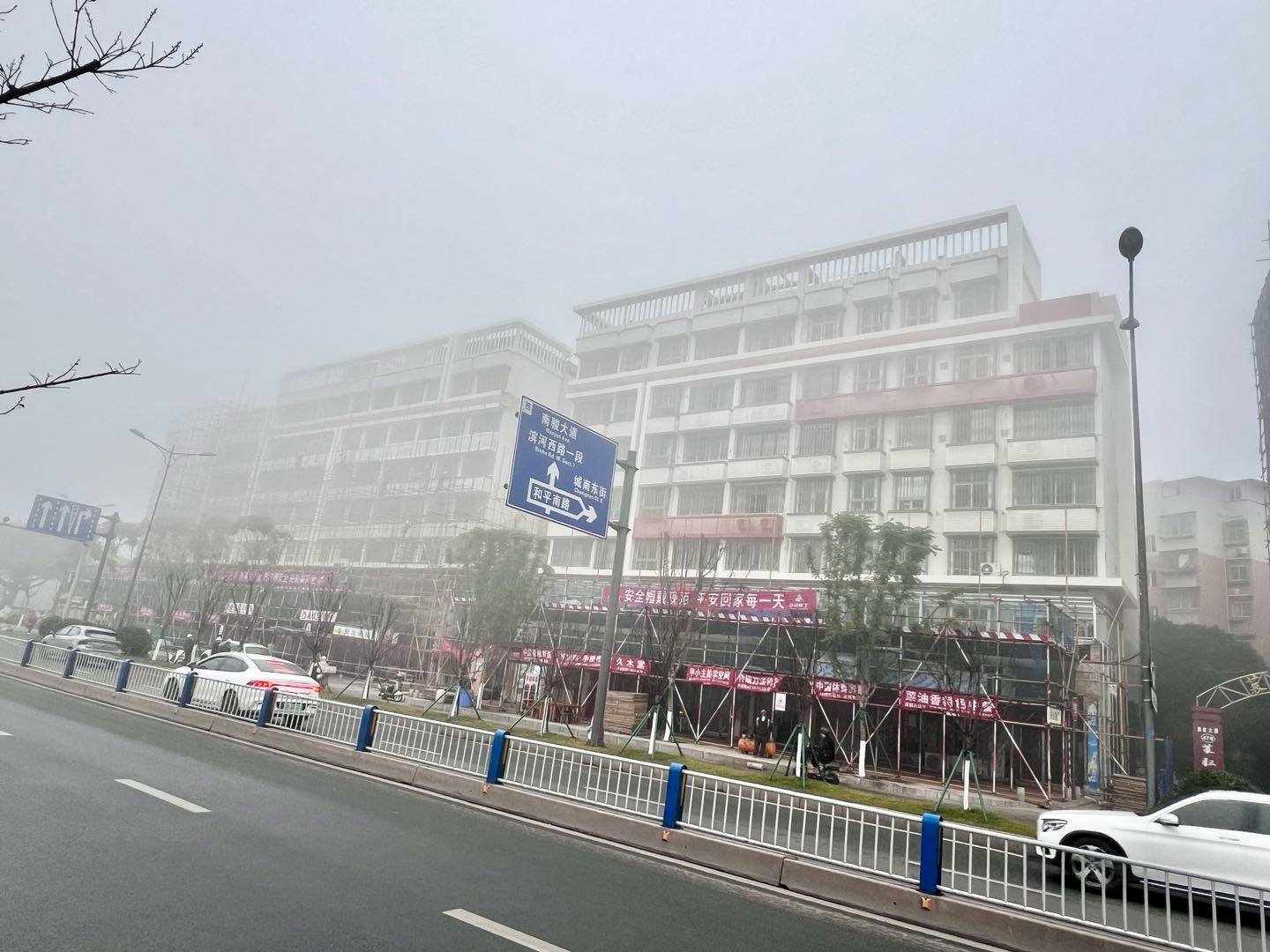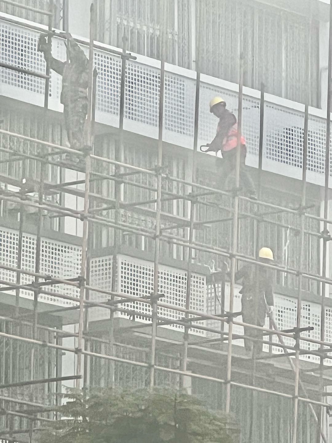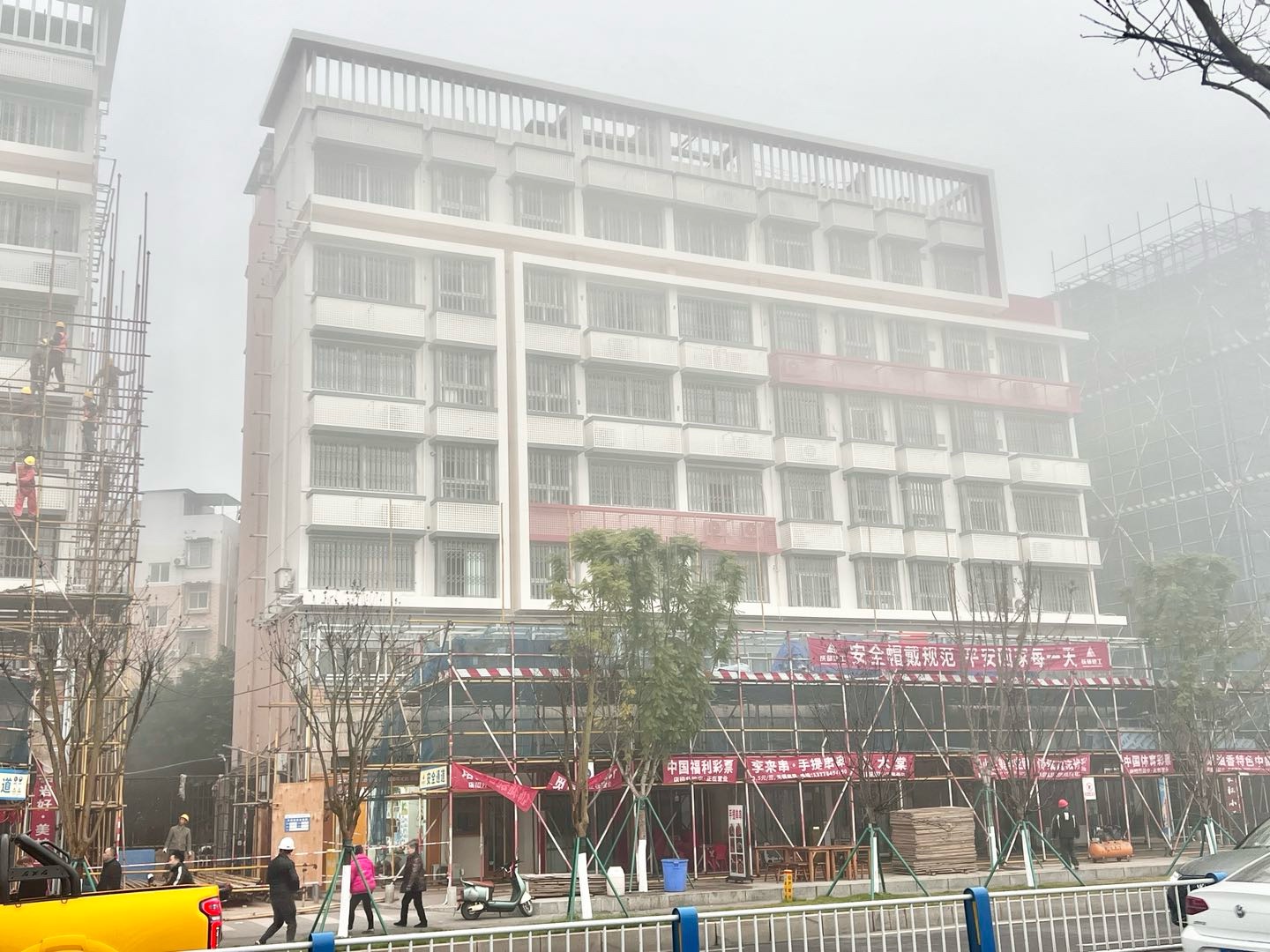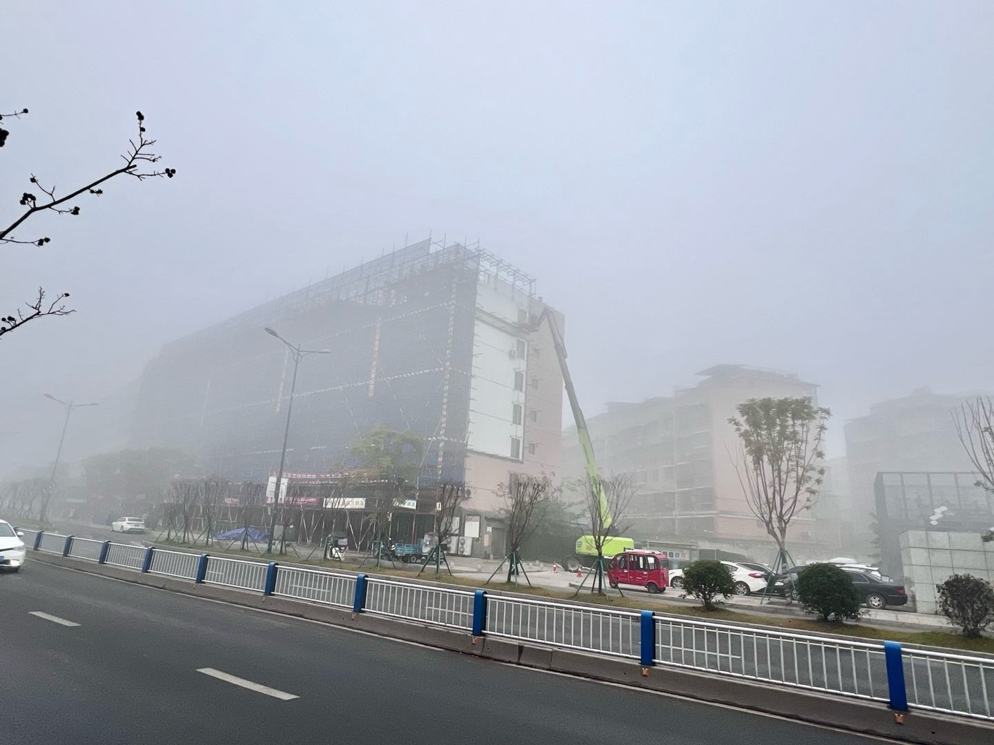 一早大雾弥漫,寒气逼人。可苌弘广场丁字路口的高楼装修现场一片繁忙。工人们冒着严寒,在浓雾中拆除已完成楼面装修的脚手架、转运钢管、建材等,各个环节紧张有序。